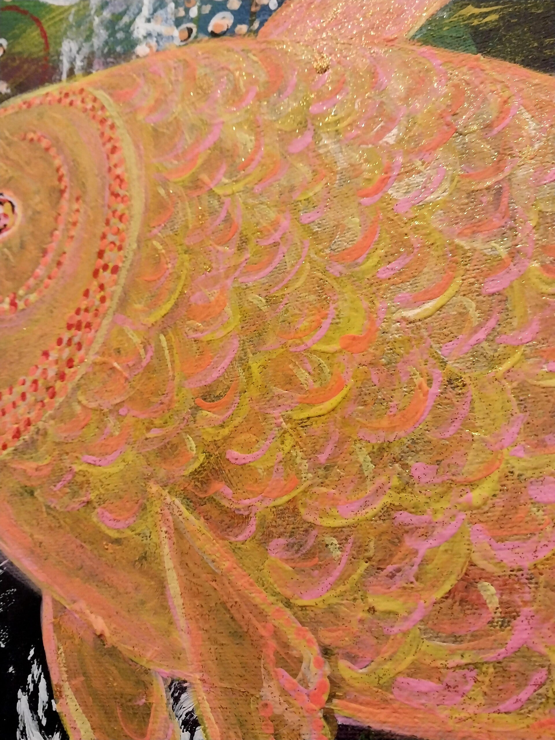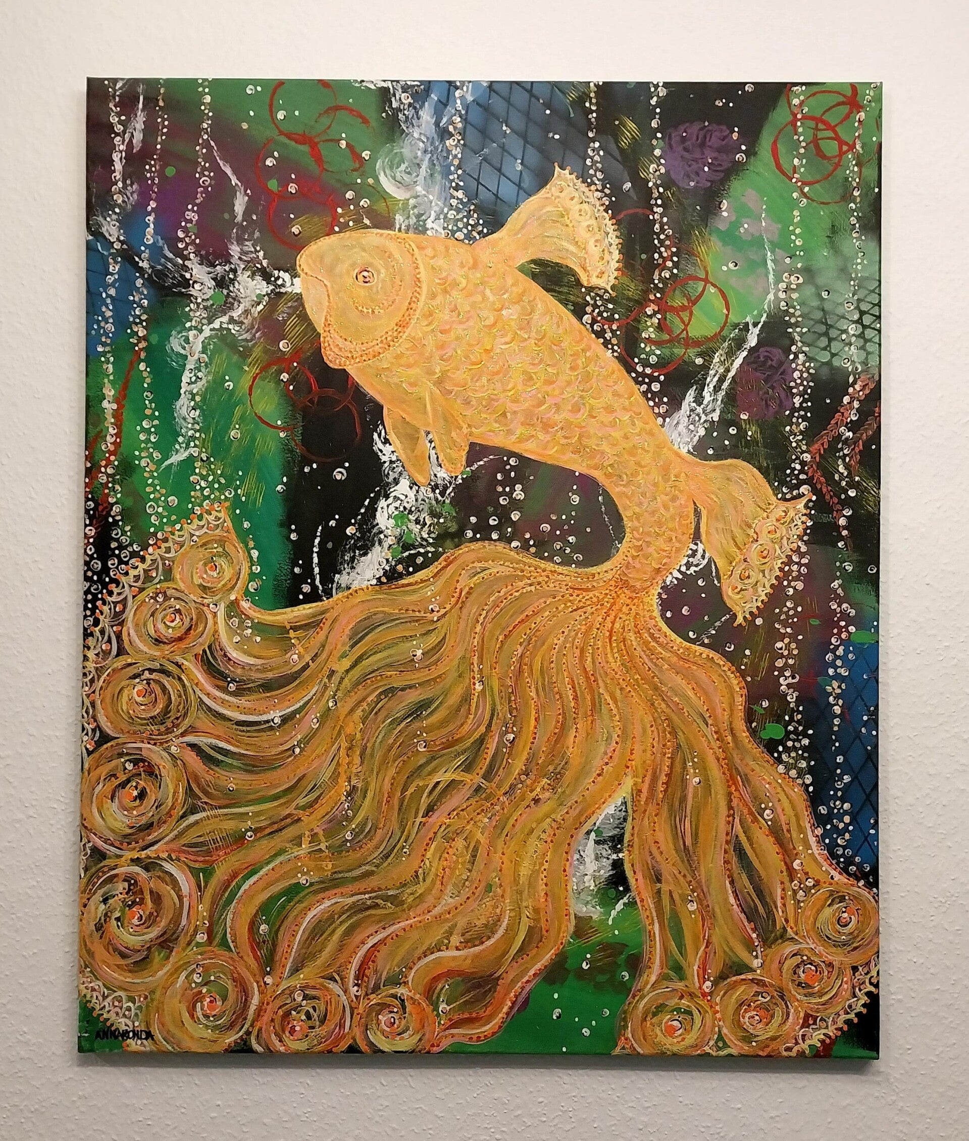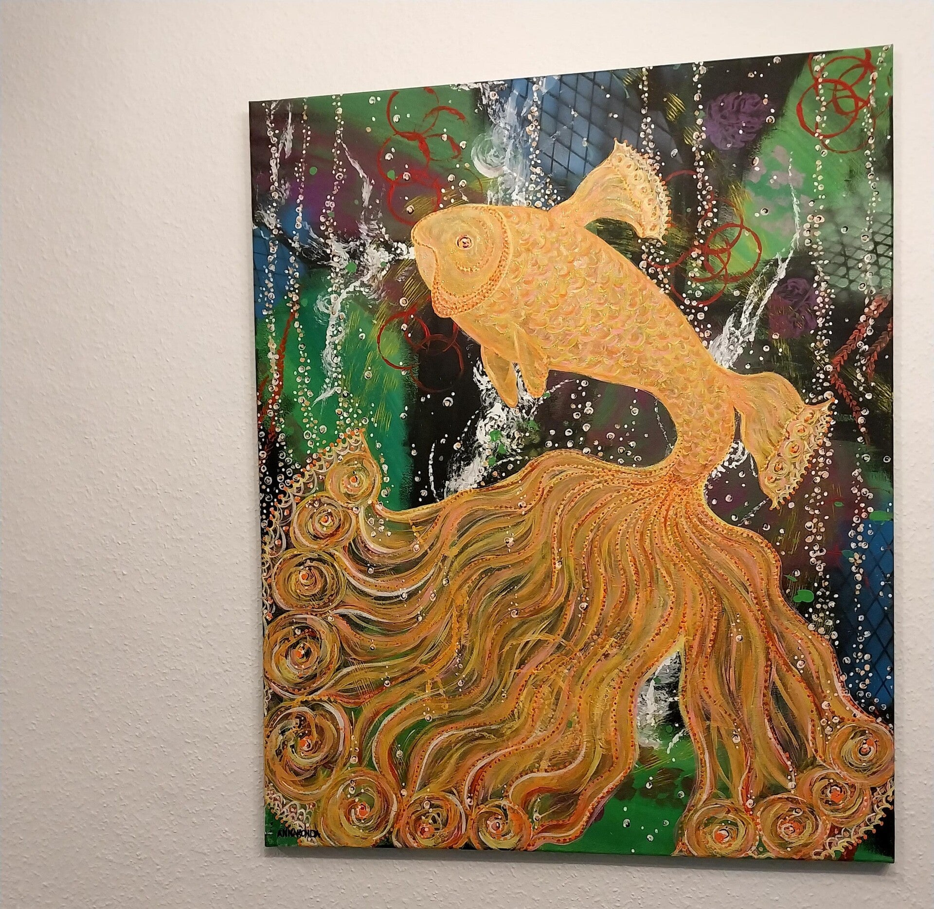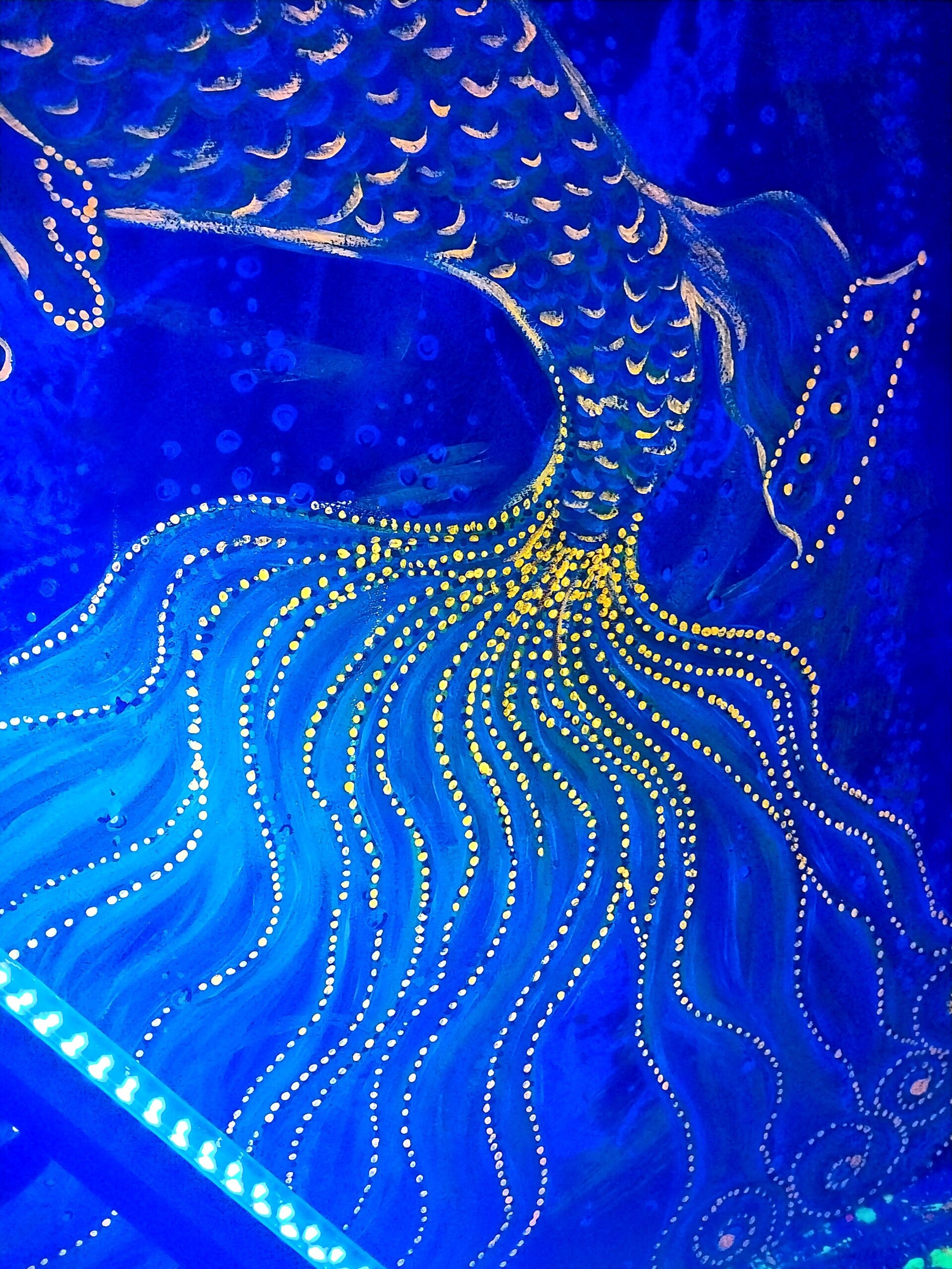 “Golden Glow” is an original painting of a golden fish created with neon paints. In daylight it captivates with vibrant colors and rich details, while under UV light the artwork glows, revealing its magical fluorescent effect. A unique fusion of art and light that creates a truly mesmerizing atmosphere.
