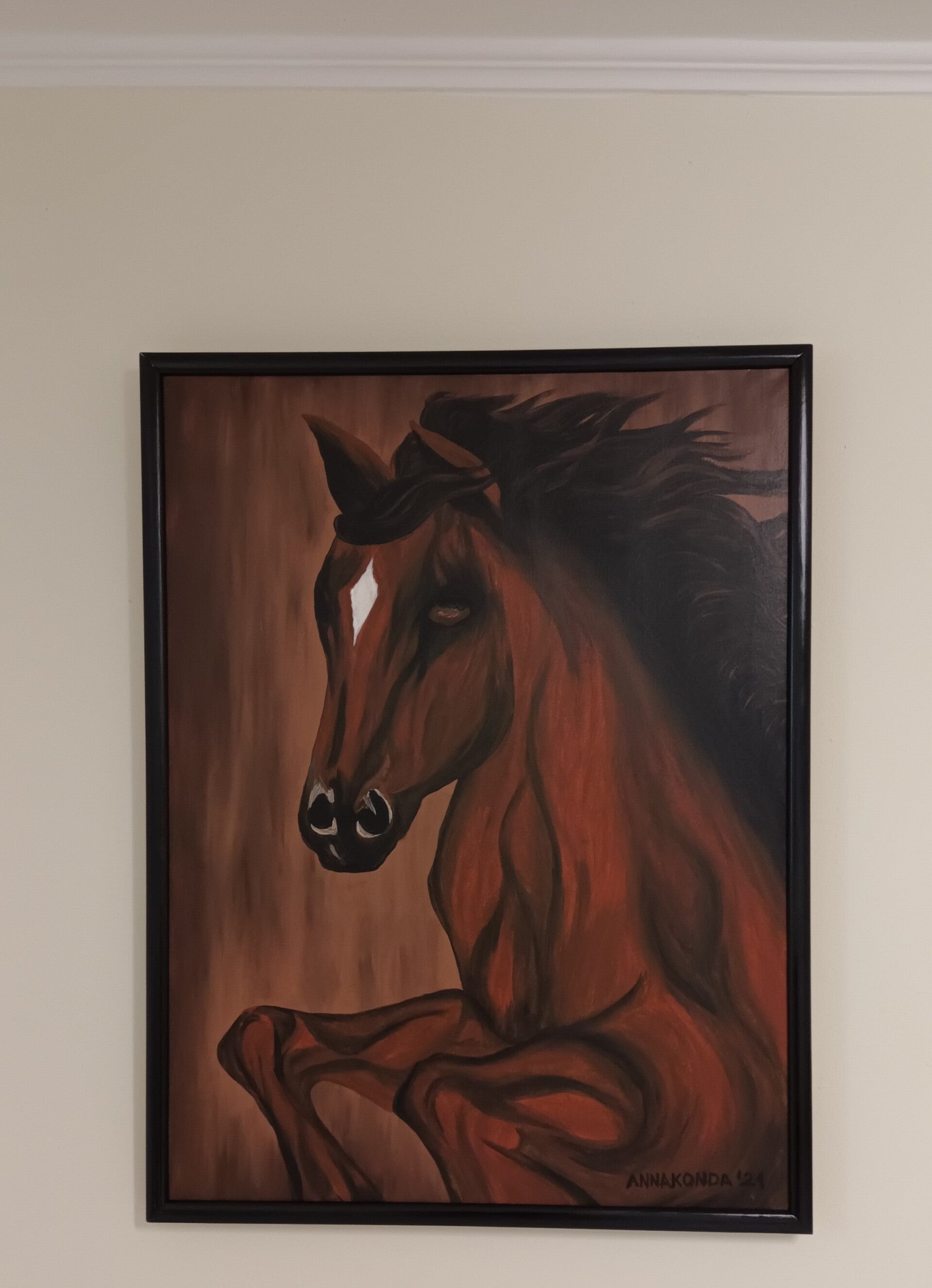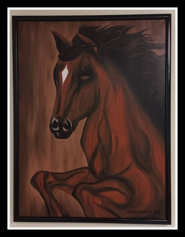 Ein warmes Gemälde eines Pferdes in Bewegung, das Anmut, Kraft und stille Energie zeigt.