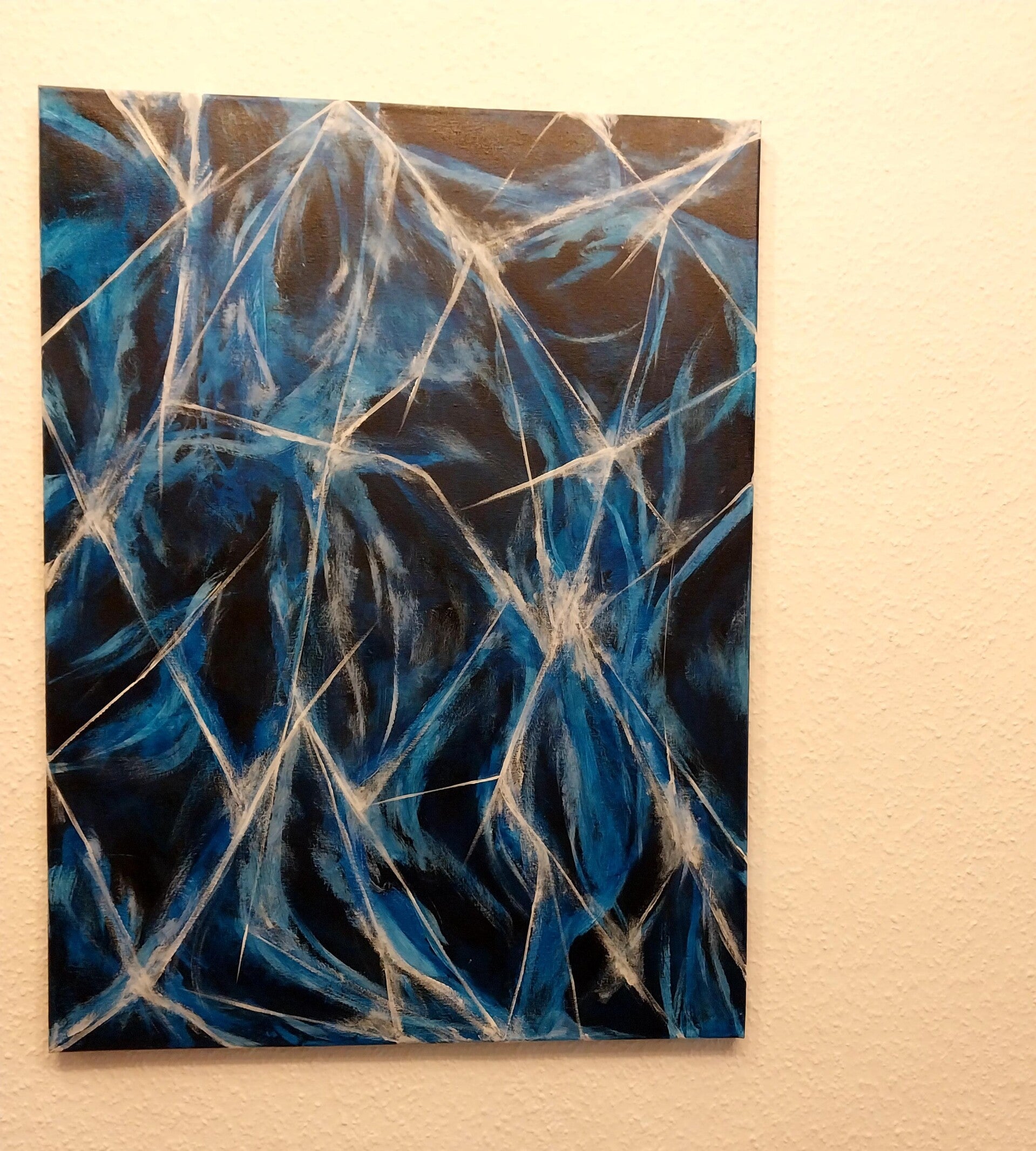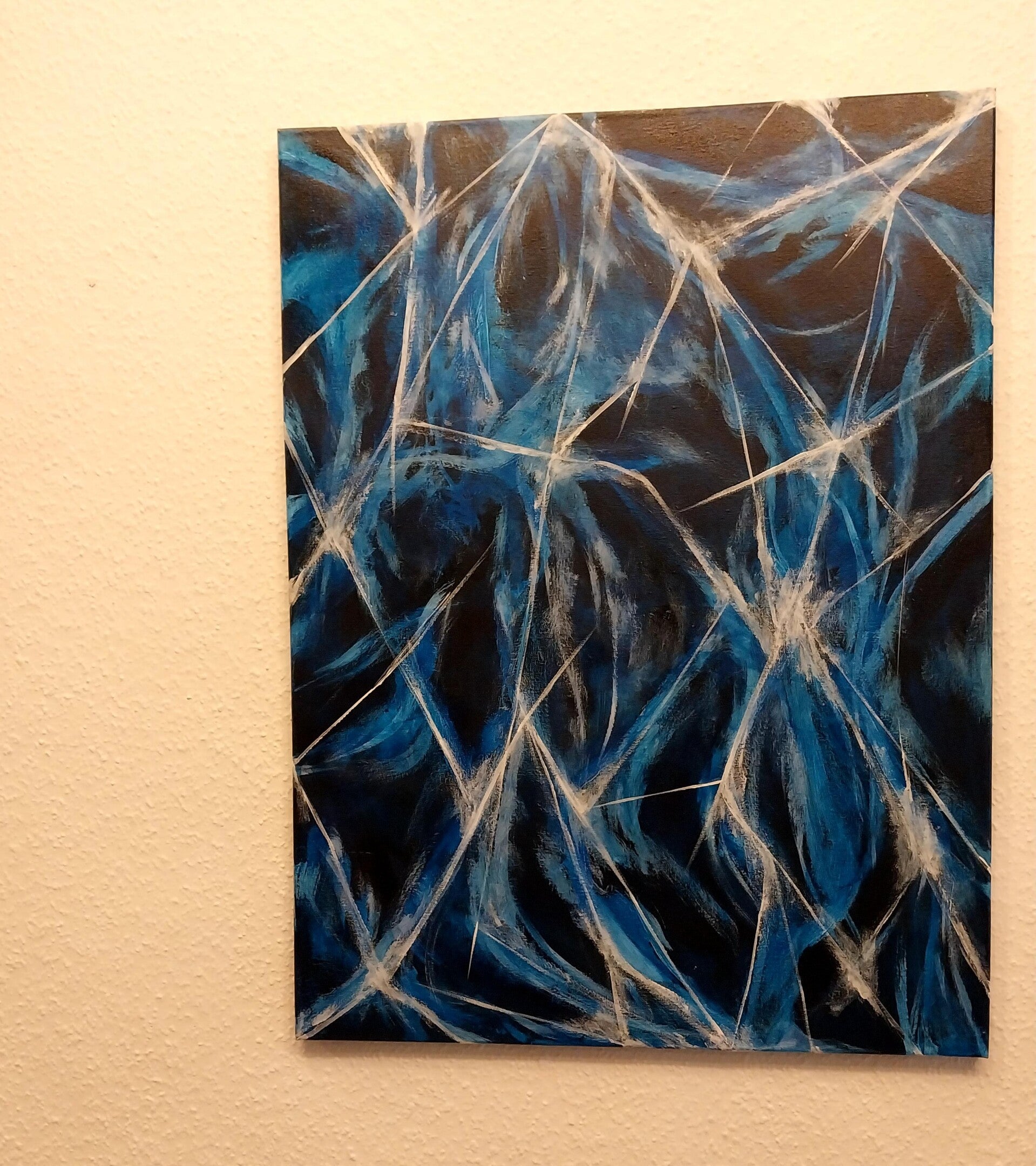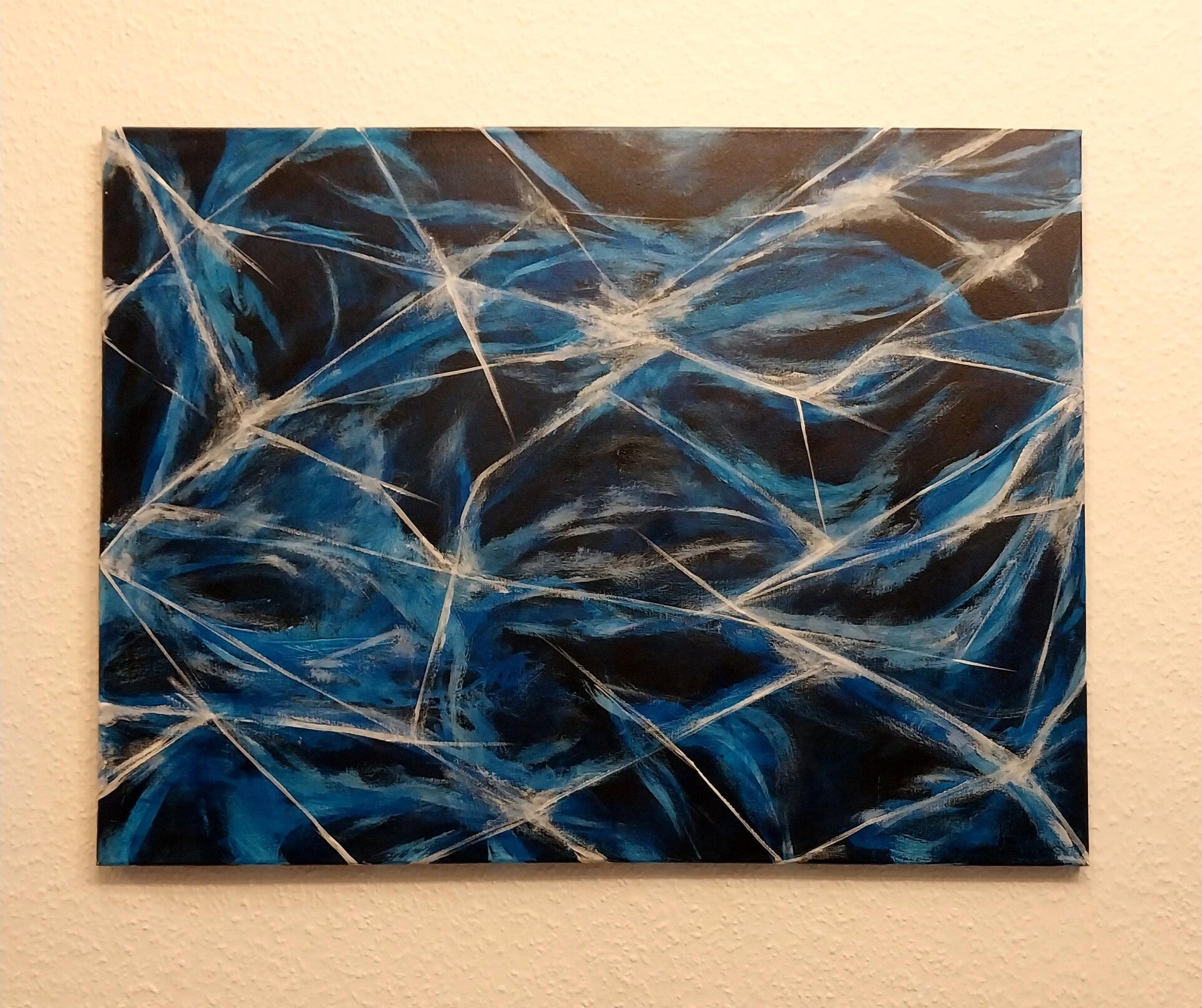 "Glimmers in the Dark" is an abstract composition of luminous blue and white streaks crossing a deep, shadowy background. The intersecting lines suggest sudden bursts of energy cutting through stillness. The painting explores the tension between darkness and light, chaos and clarity, capturing the fleeting beauty of illumination emerging from obscurity.