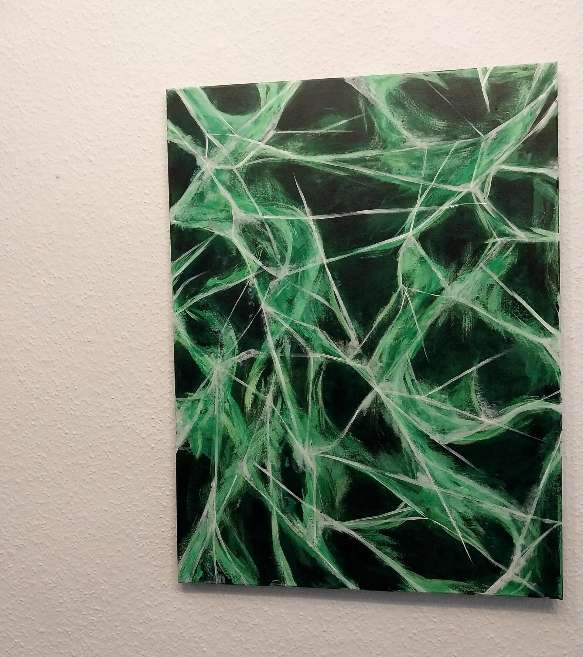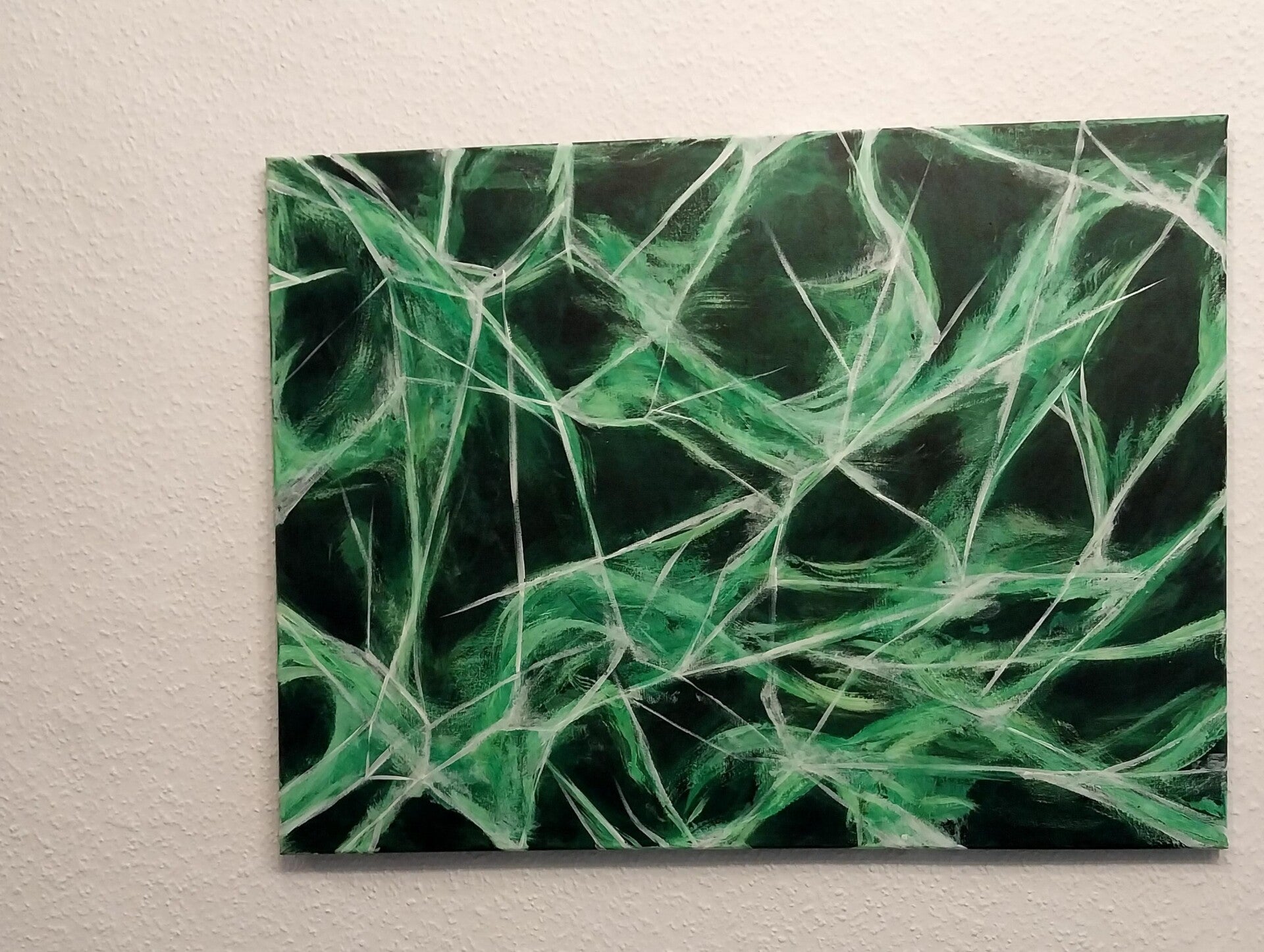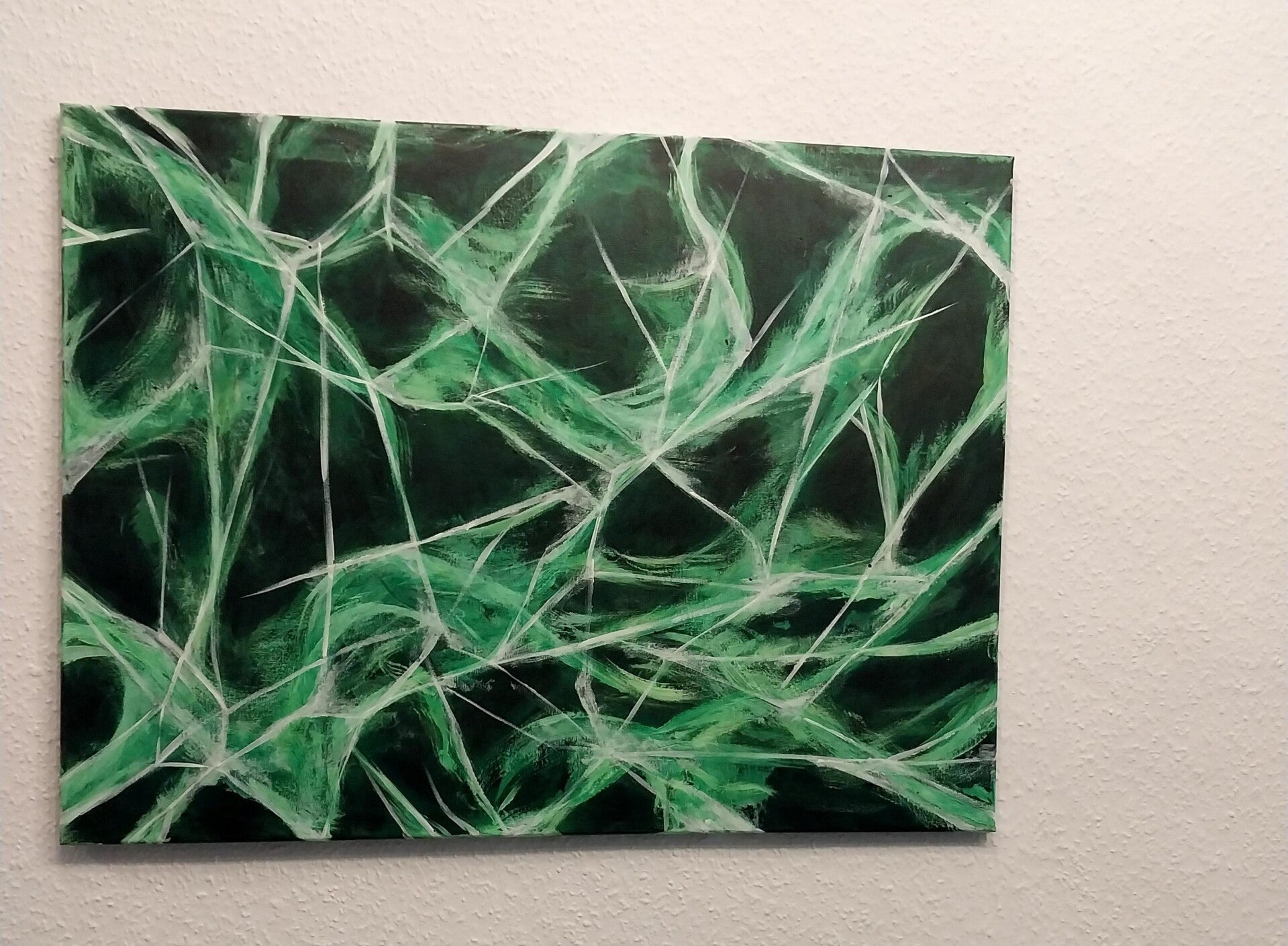 Das Gemälde zeigt den Übergang von Stille zu Wachheit. Verflochtene grüne und weiße Linien treten aus dem dunklen Hintergrund hervor wie Gedanken, die aus dem Schlaf auftauchen. Die dynamische Bewegung verbindet sich mit ruhiger Tiefe und steht für das Erwachen des Bewusstseins, innere Erneuerung und die Rückkehr zur Klarheit nach der Ruhe.