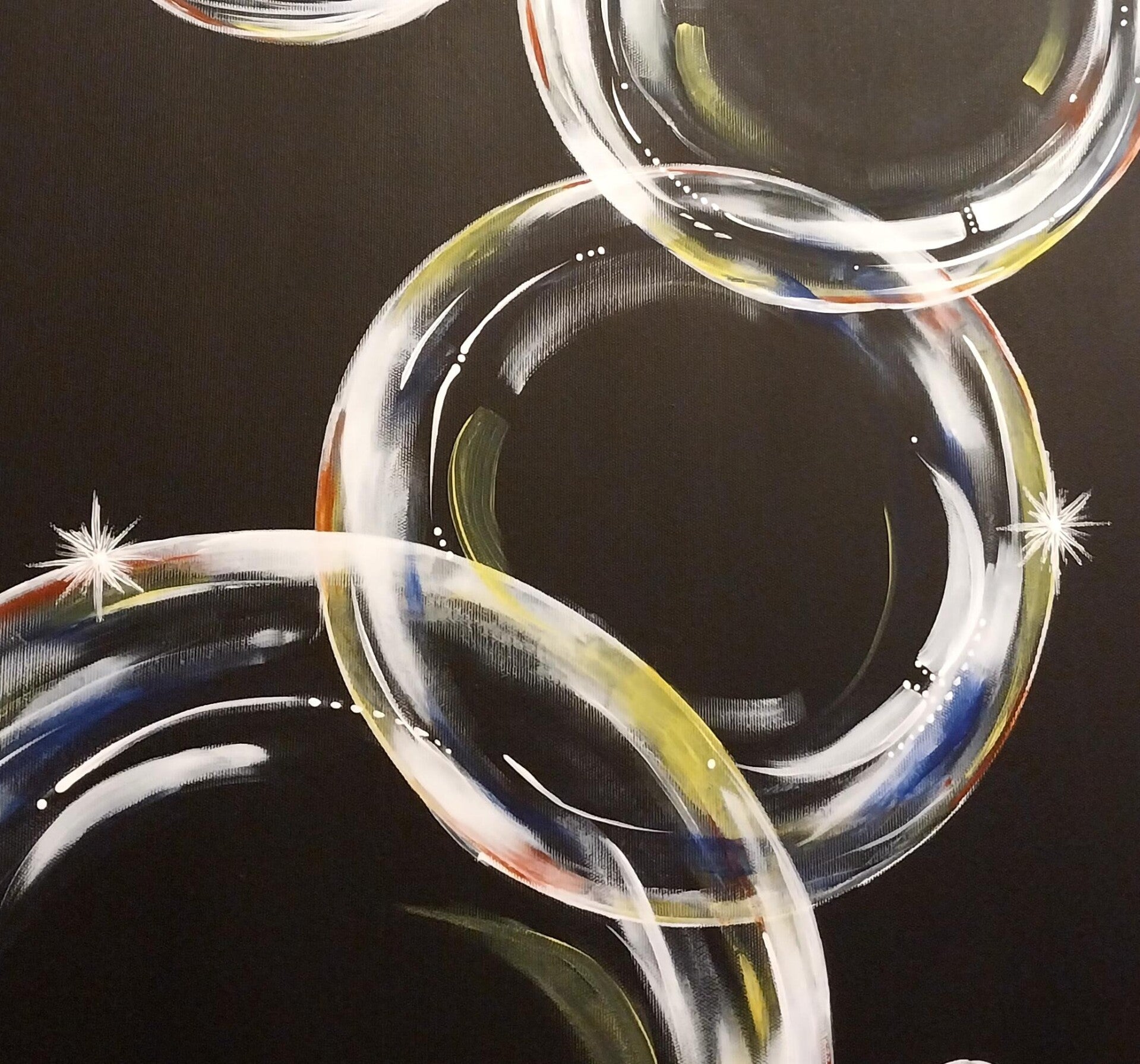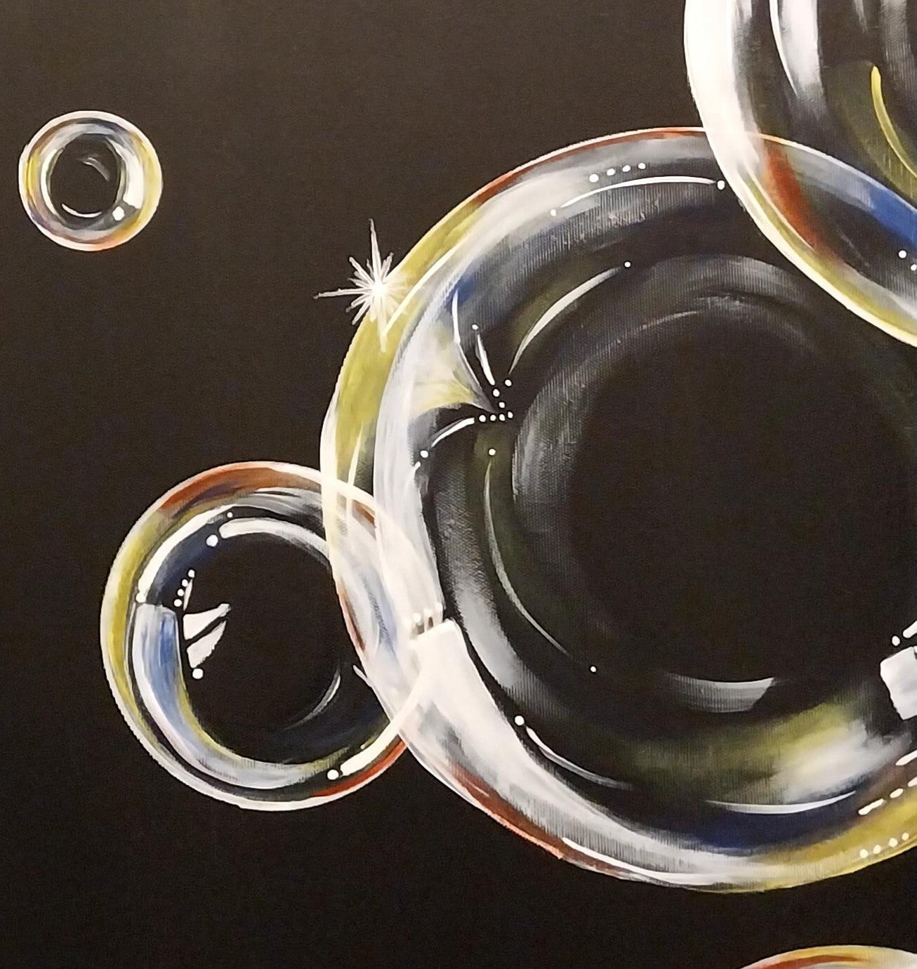 The painting depicts soap bubbles floating in space, varying in size and shimmering against a deep black background. Gentle light reflections create pearly highlights and subtle iridescent edges, giving the composition a sense of lightness and motion. The transparent spheres appear to dance silently, symbolizing the fleeting nature of moments, childlike joy, and the beauty of simple natural phenomena. The contrast between the luminous bubbles and the dark background enhances the feeling of depth and draws attention to the delicate interplay of light and transparency.