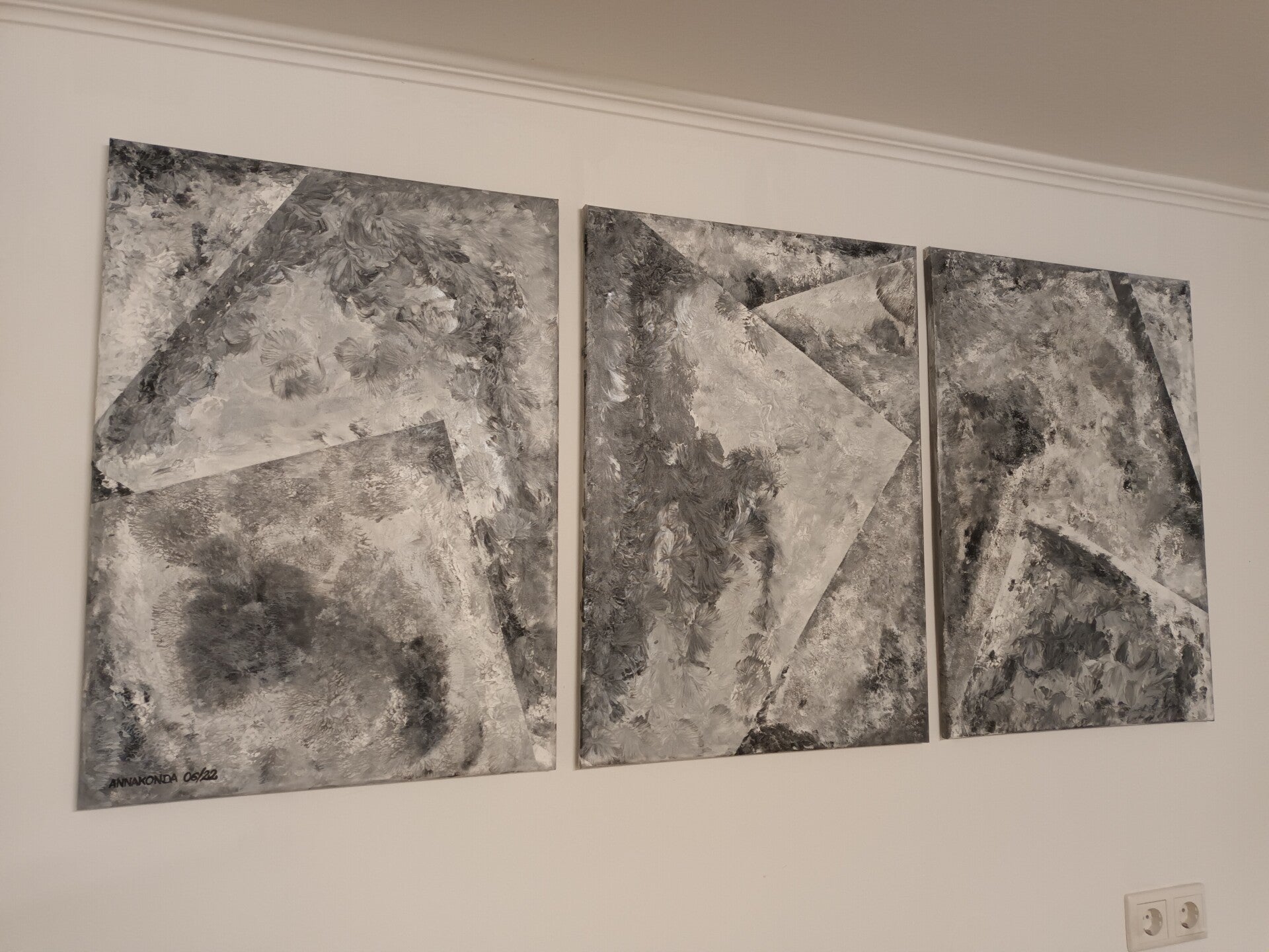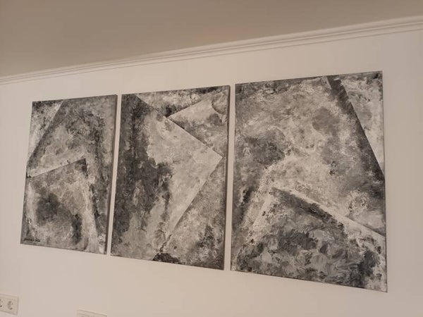 This triptych is an abstract composition combining geometric forms with expressive textures. The works explore the emotional tension between structure and chaos, as well as the ongoing process of change.