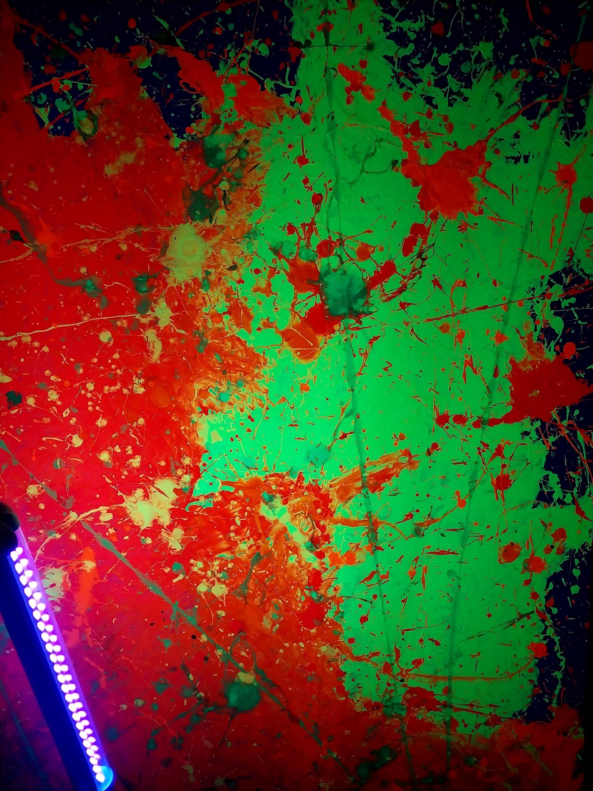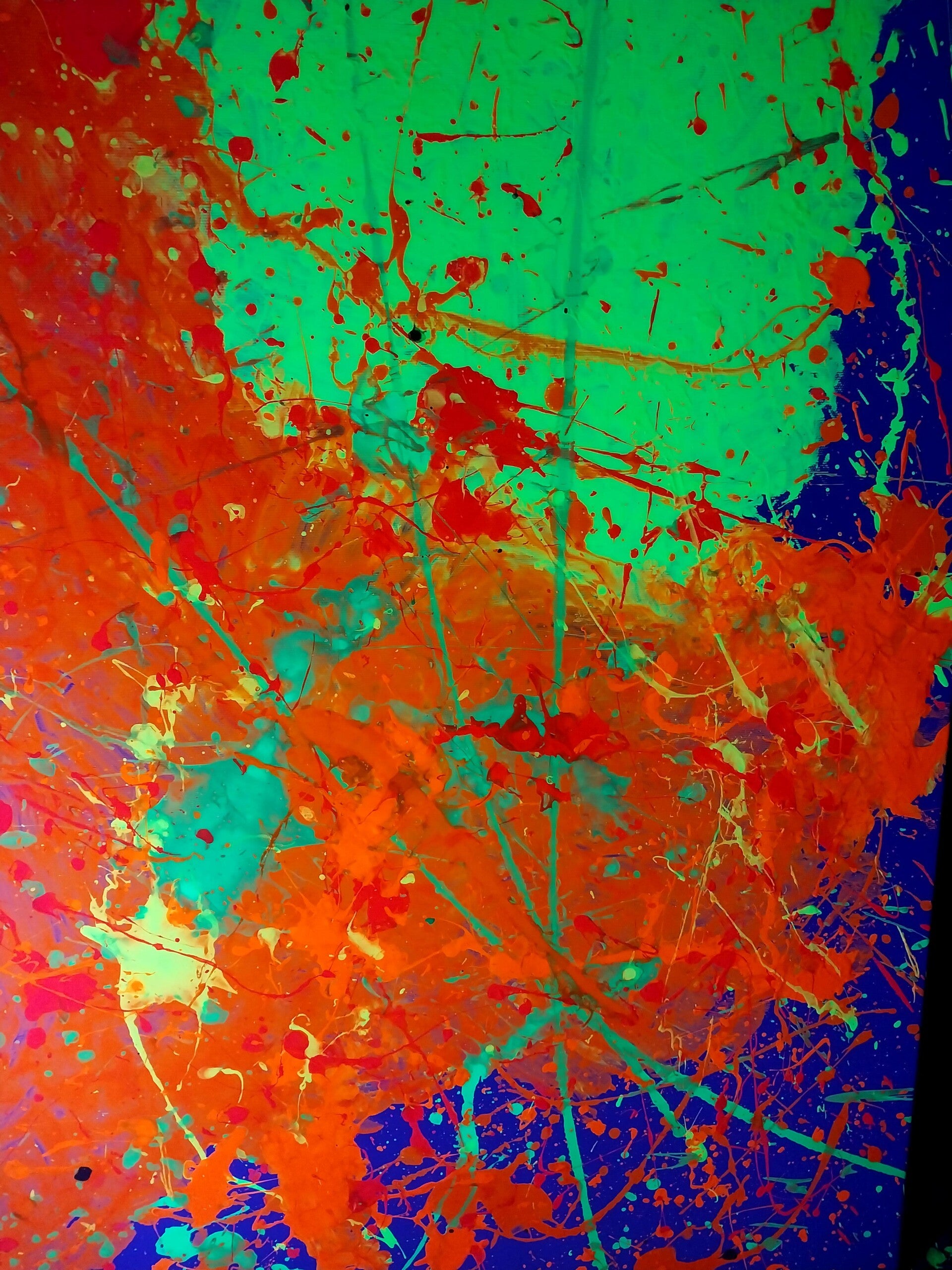Dieses Gemälde ist eine Explosion aus Energie, Farbe und Licht – eine abstrakte Komposition, gemalt mit Neonfarben, die unter UV-Licht zum Leben erwachen. Bei normalem Licht faszinieren kraftvolle Rot-, Gelb- und Grüntöne in einer dynamischen, von Bewegung erfüllten Oberfläche. Doch seine wahre Magie entfaltet sich im Dunkeln: Unter der UV-Lampe beginnt die Leinwand zu leuchten, und die Farben pulsieren wie lebendige Lichtstrukturen. „Neon Pulse“ spielt mit dem Kontrast zwischen dem Sichtbaren und der verborgenen leuchtenden Dimension – ein Bild, das buchstäblich zum Leben erwacht, wenn die Nacht hereinbricht.
