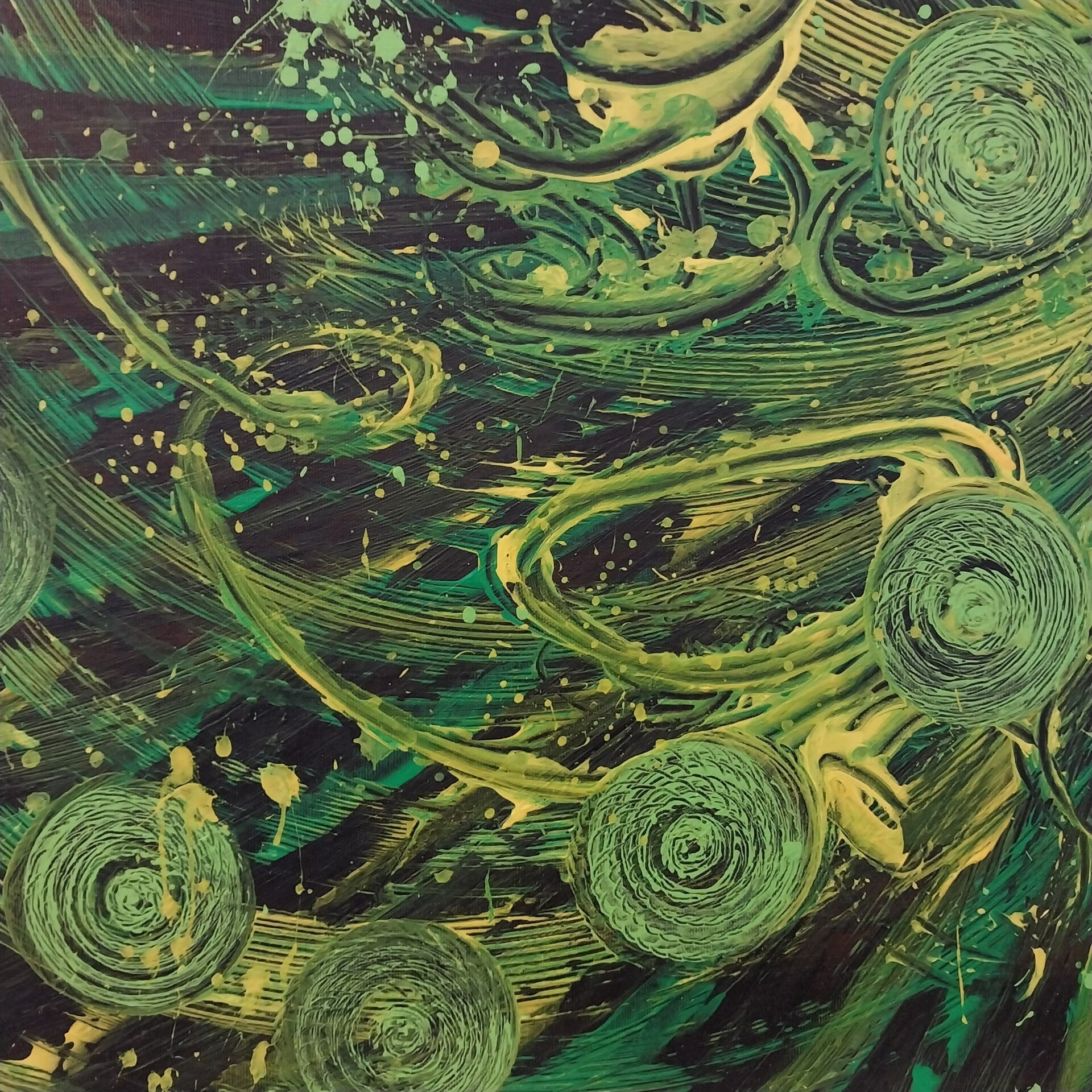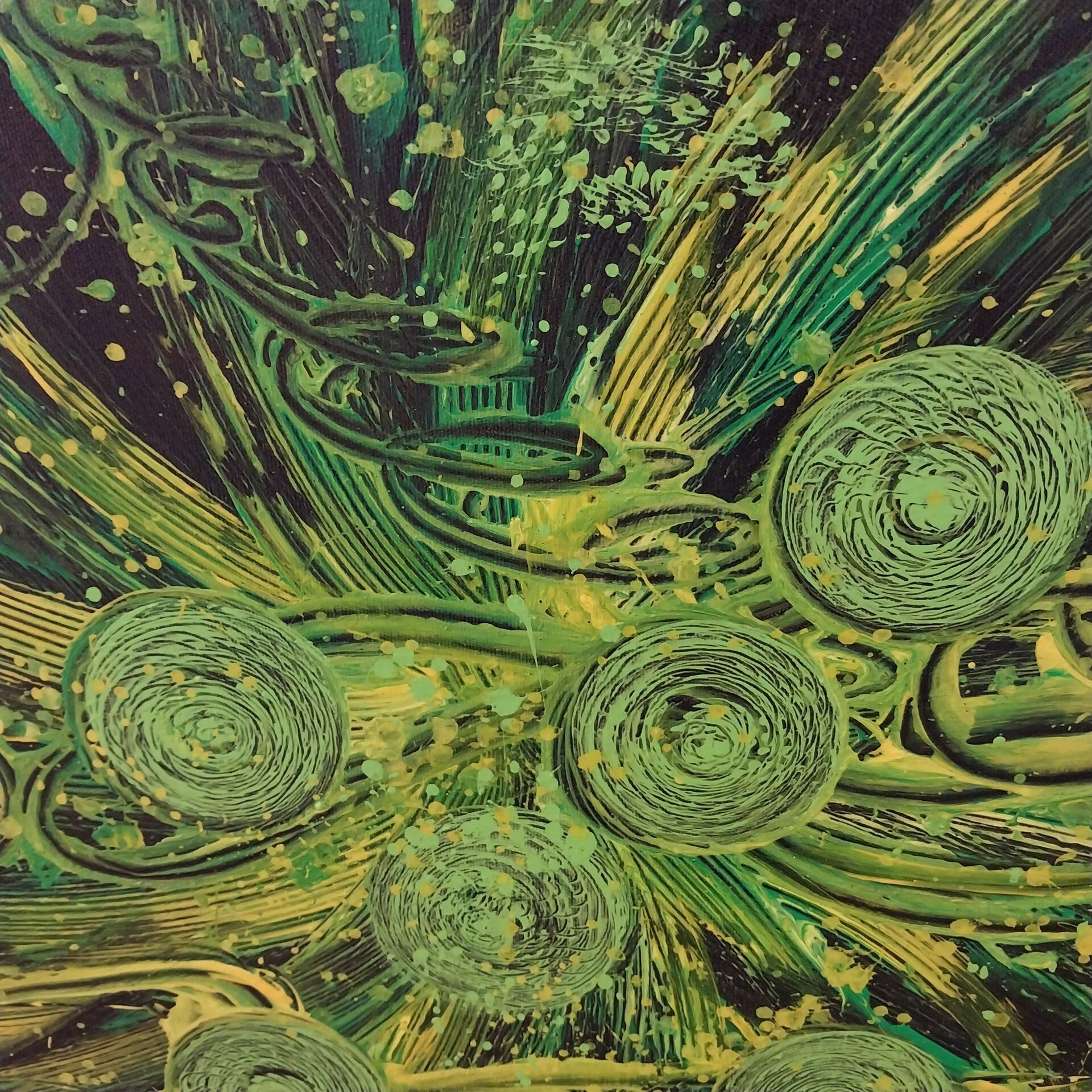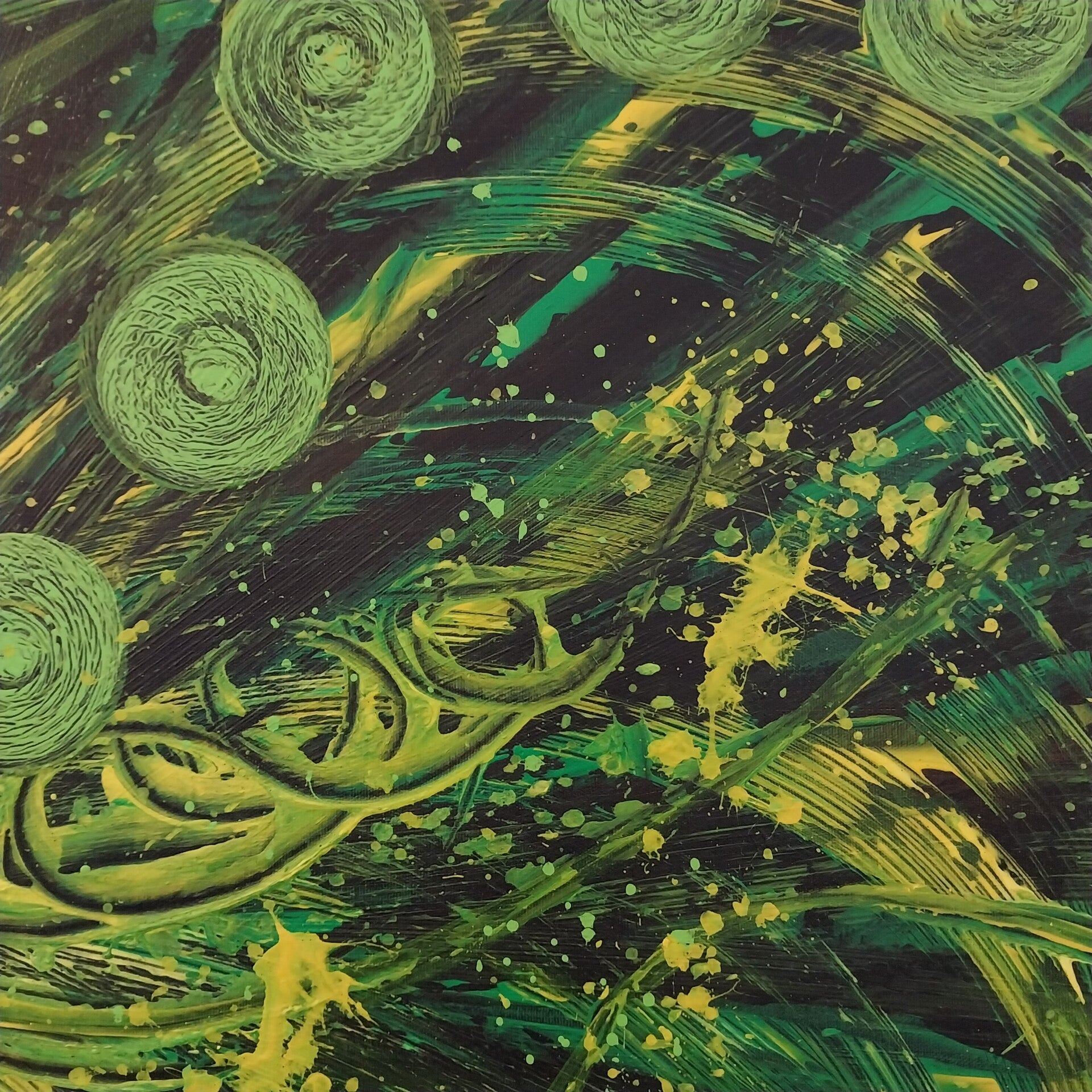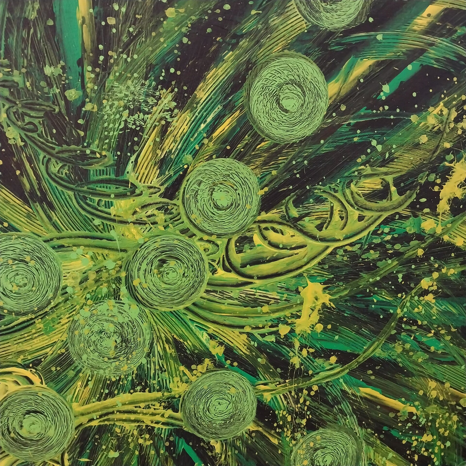 The painting reflects the pulsating energy of the Universe through swirling green spirals of light. They symbolize life force, harmony, and the continuous flow of positive energy between the cosmos and human consciousness. Green fills the space like a cosmic aura of renewal, peace, and hope.