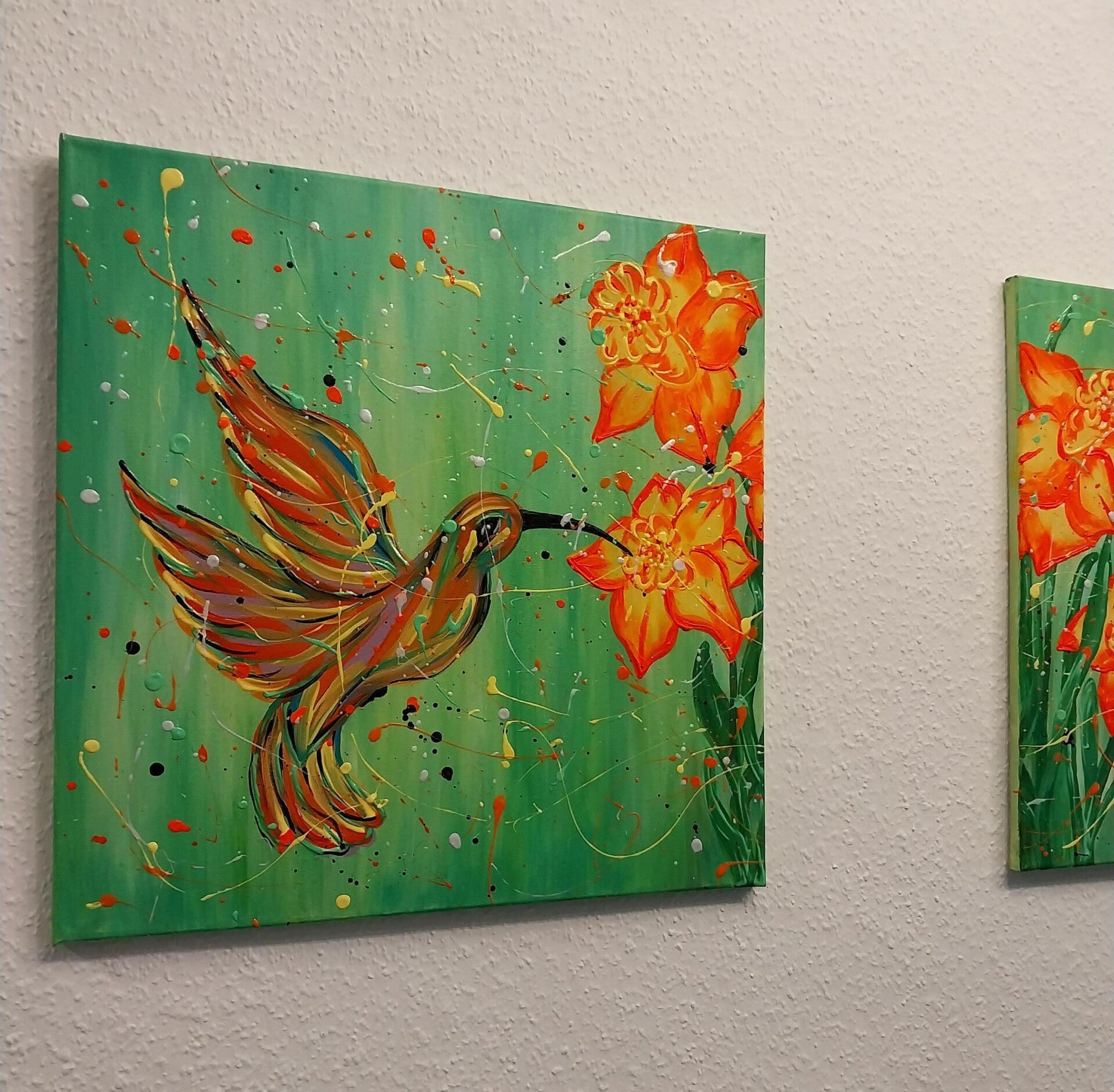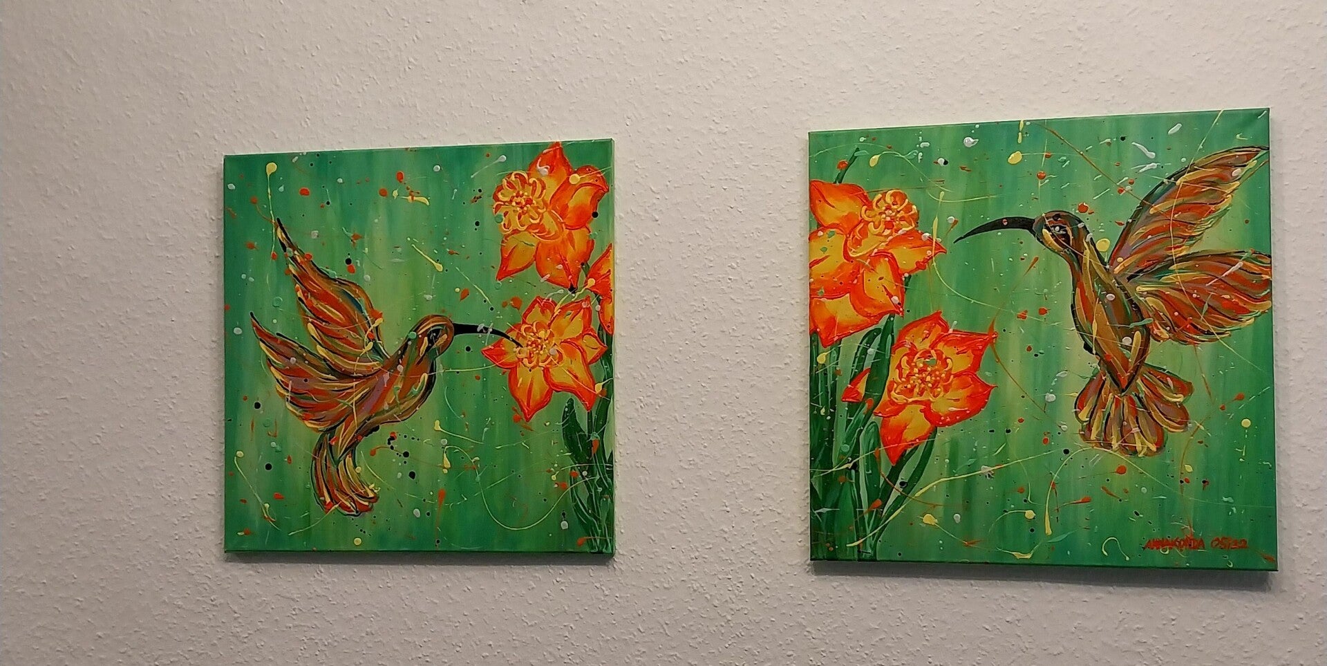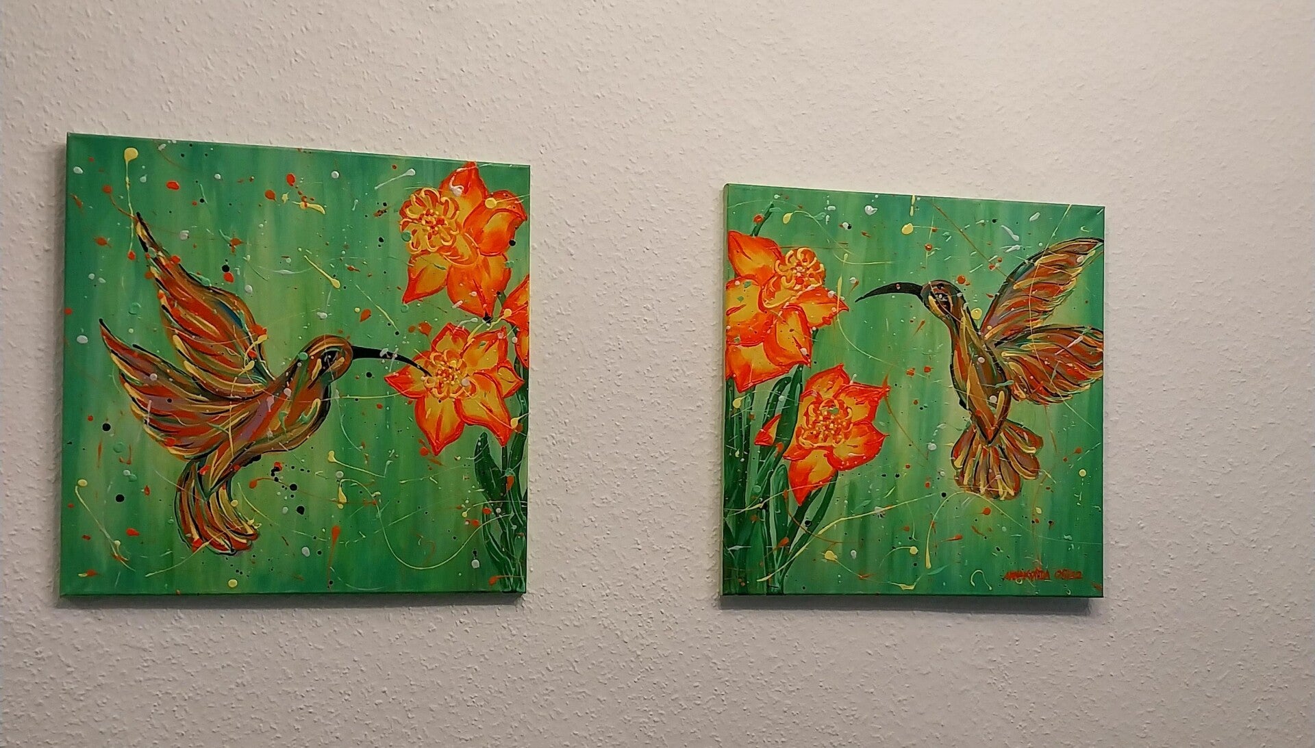 Dwa obrazy przedstawiające kolibry przy kwiatach, namalowane farbami neonowymi. Pod światłem UV delikatnie rozbłyskują, tworząc magiczną, spokojną atmosferę. Kompozycje łączą się w jedną całość – motyw kwiatów spaja oba płótna w harmonijną opowieść o bliskości natury i chwili zatrzymanego spokoju. Sprzedawane jako zestaw.