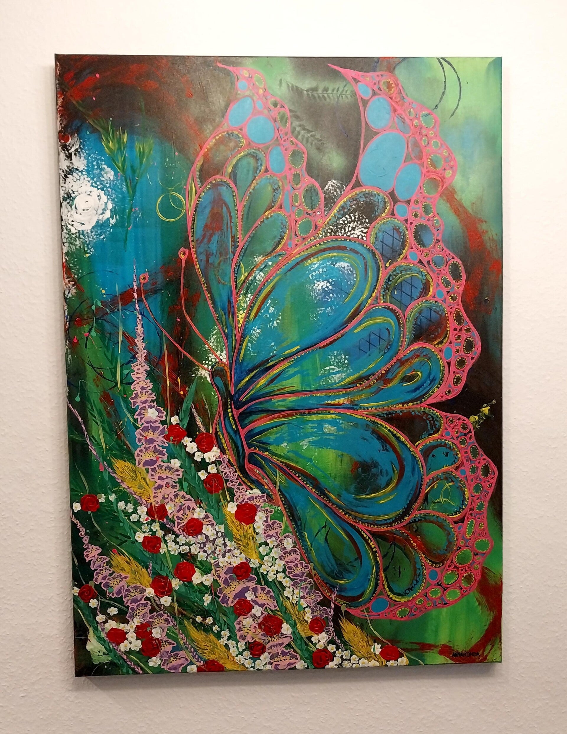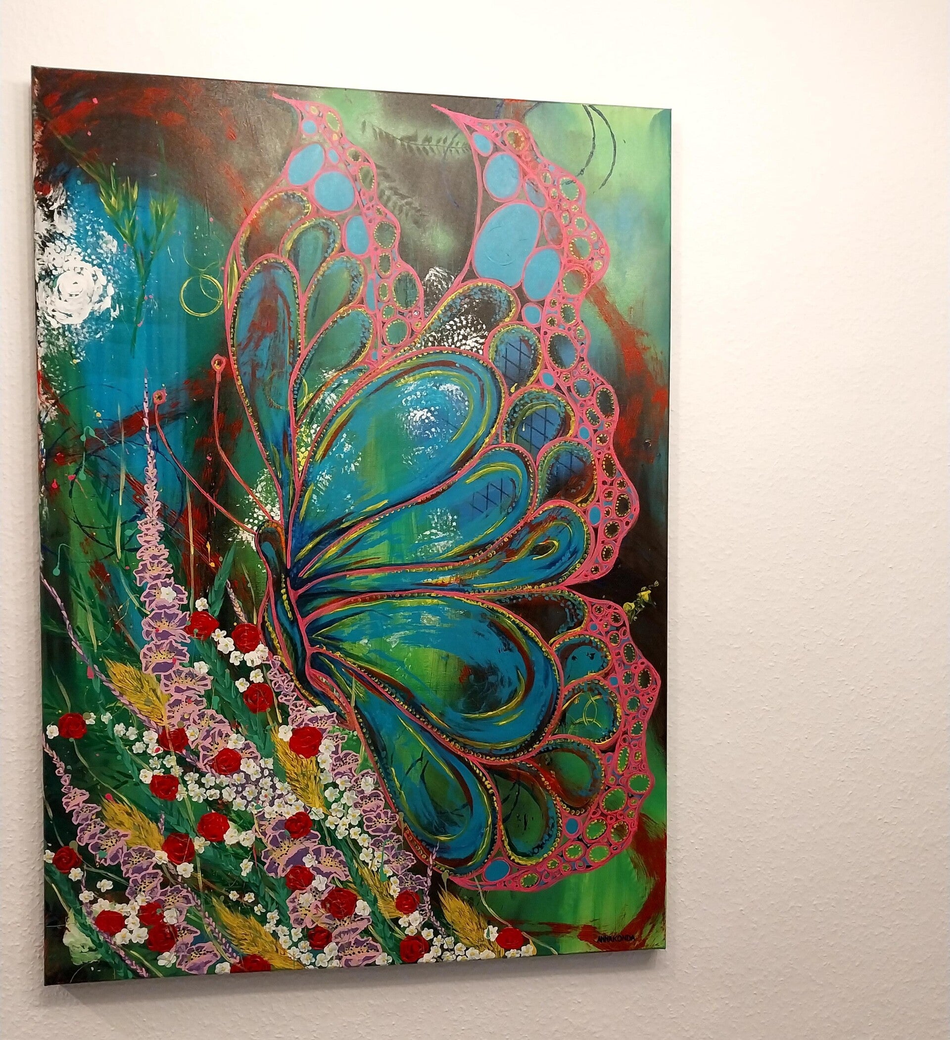 Ein magischer Schmetterling schwebt über einer Wiese, auf der die Farben leuchten und die Blumen im Takt einer unsichtbaren Melodie schwingen. Seine Flügel erzählen von Freiheit, Träumen und der zarten Schönheit der Fantasie.